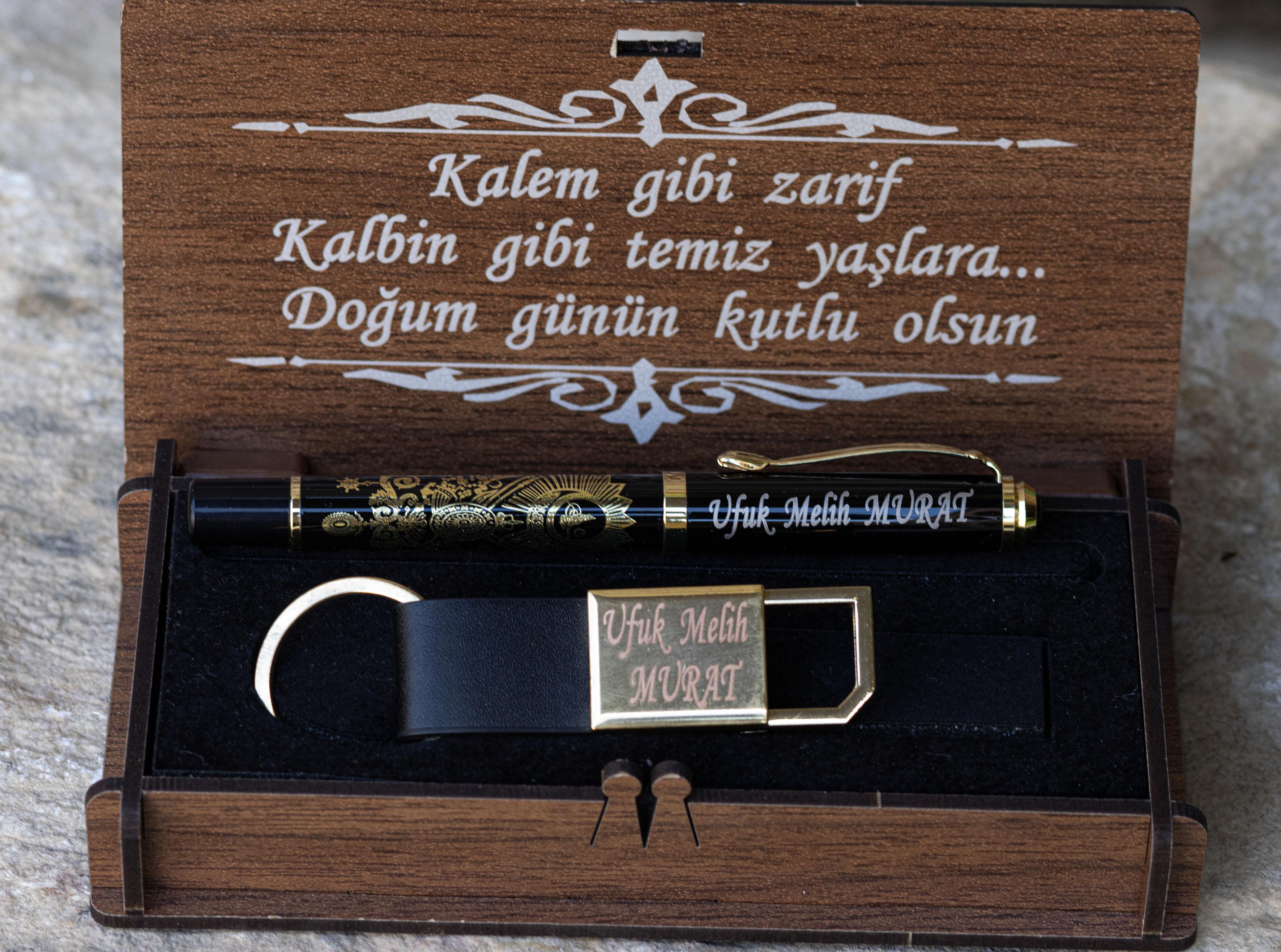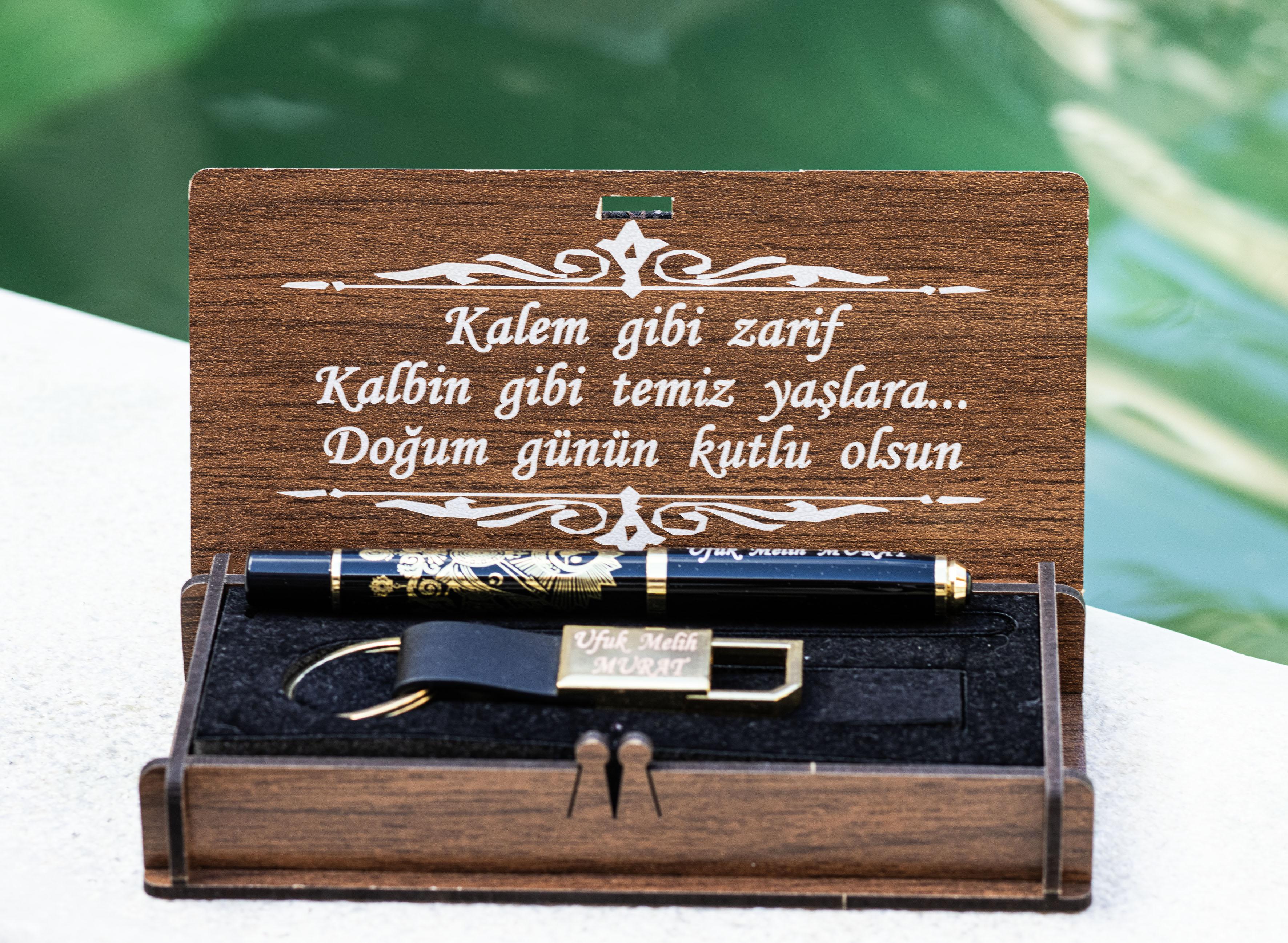İsme özel ahşap kutulu kalem ve anahtarlık seti, şıklığı ve anlamı bir arada sunan özel tasarım bir hediye setidir.
