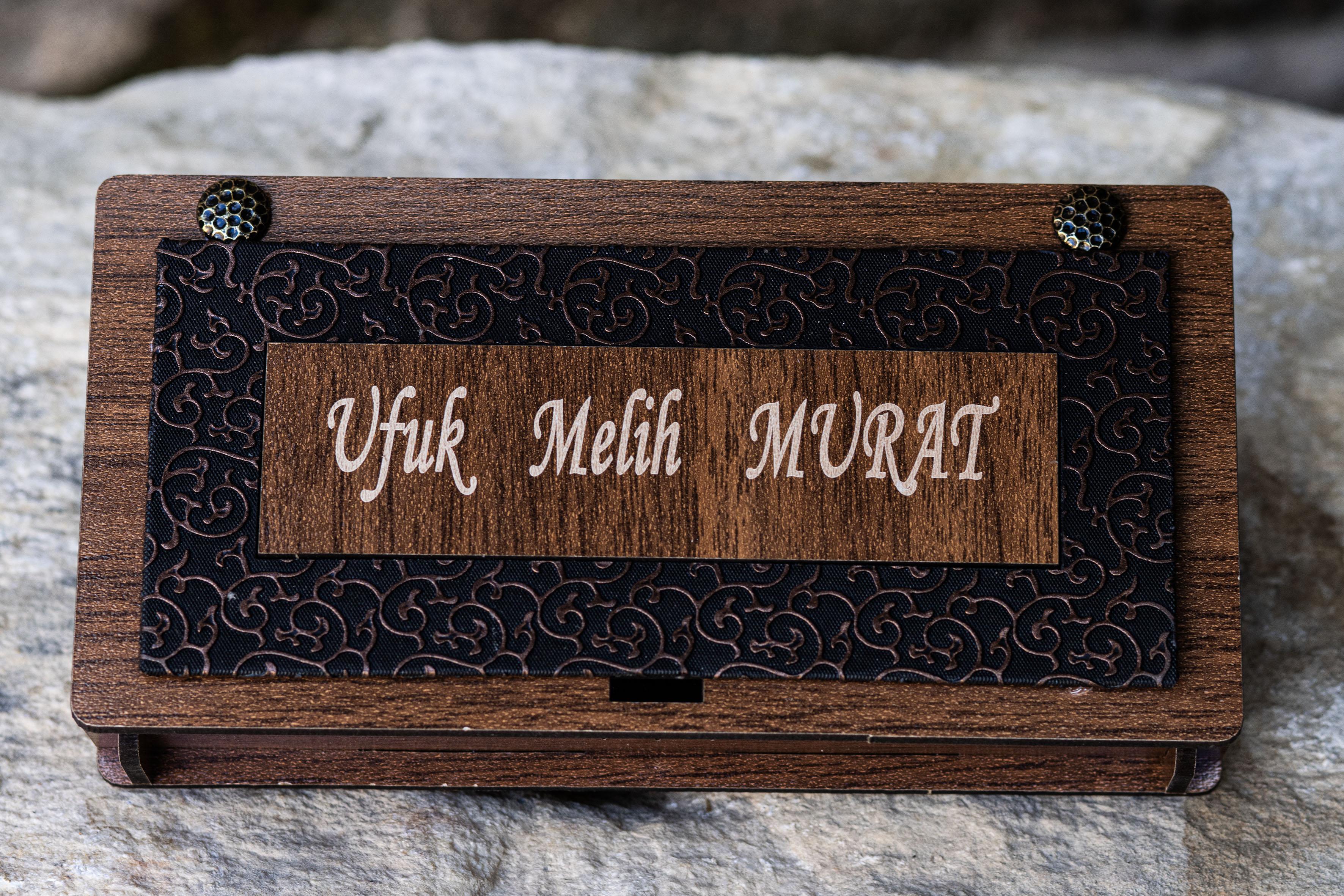 Ahşap kutu kapağına dilediğiniz özel mesaj, kalem ve anahtarlık üzerine ise isim veya isim-soyisim lazer kazıma yöntemiyle kalıcı olarak işlenir.