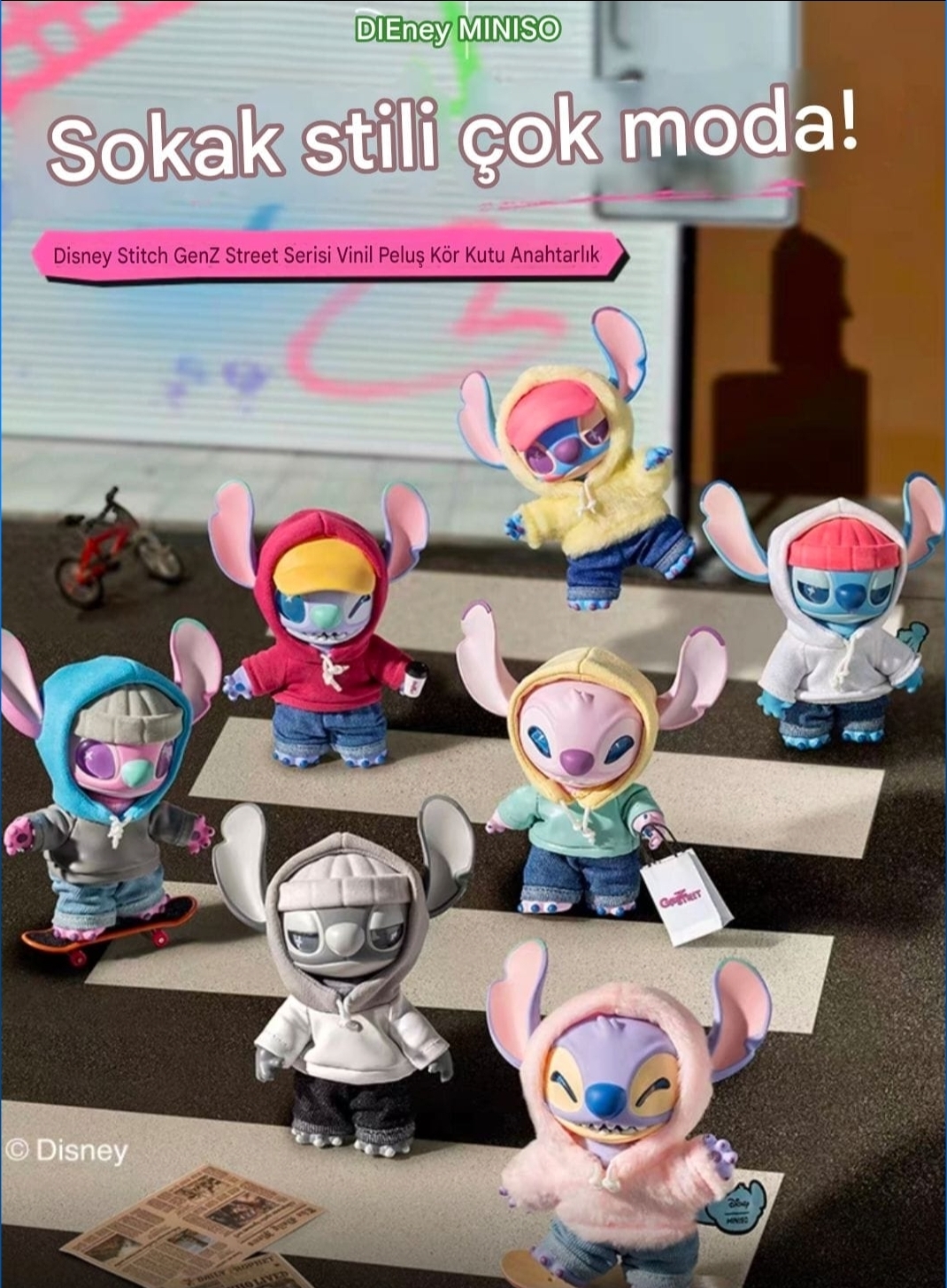 Stitch GenZ Street Series koleksiyonunda Stitch, modern sokak stilini kapüşonlu hoodie ve jean görünümüyle birleştiriyor. Kör kutu formatı sayesinde her kutu sürpriz içeriklidir ve koleksiyon yapmayı daha eğlenceli hale getirir.