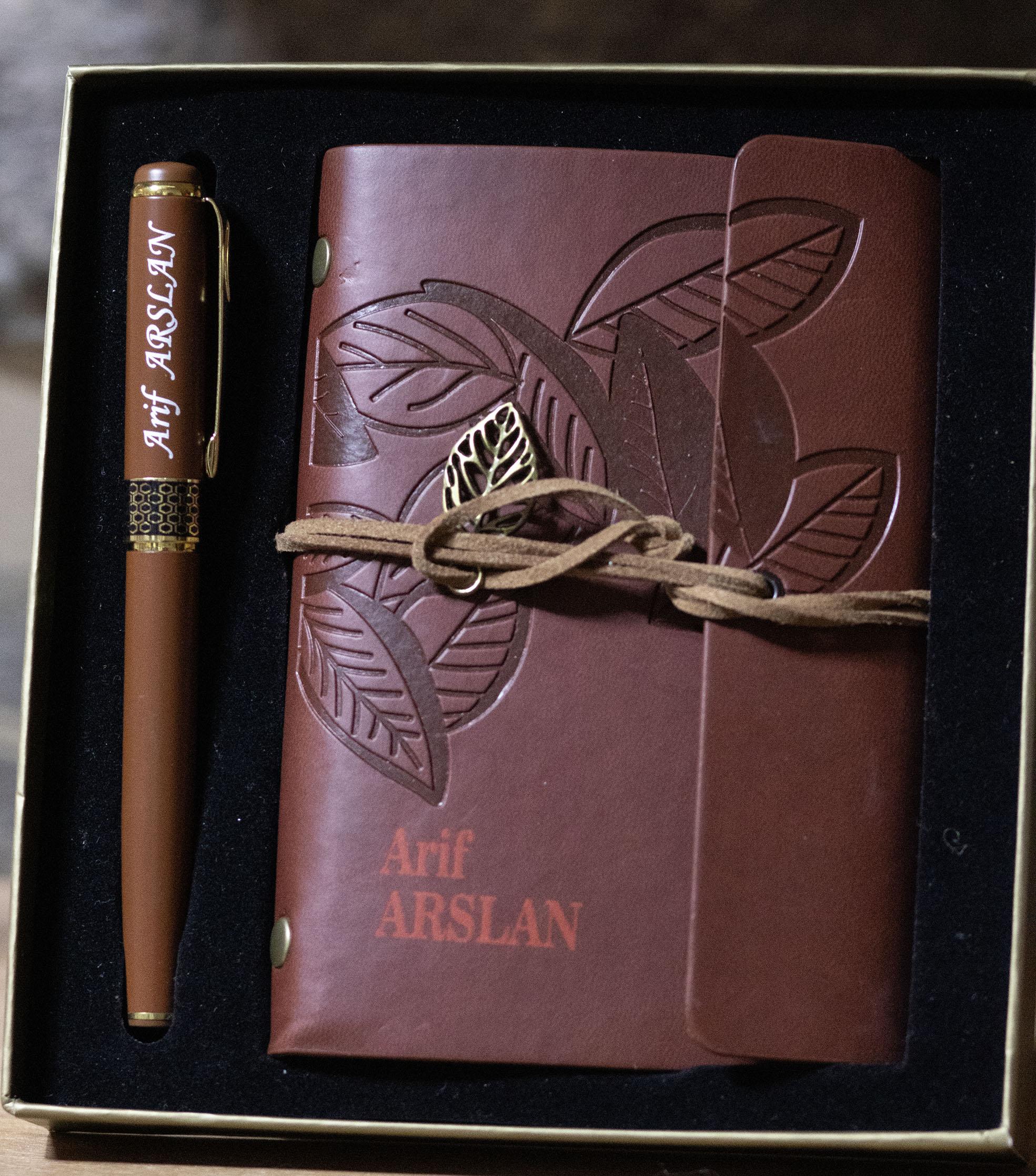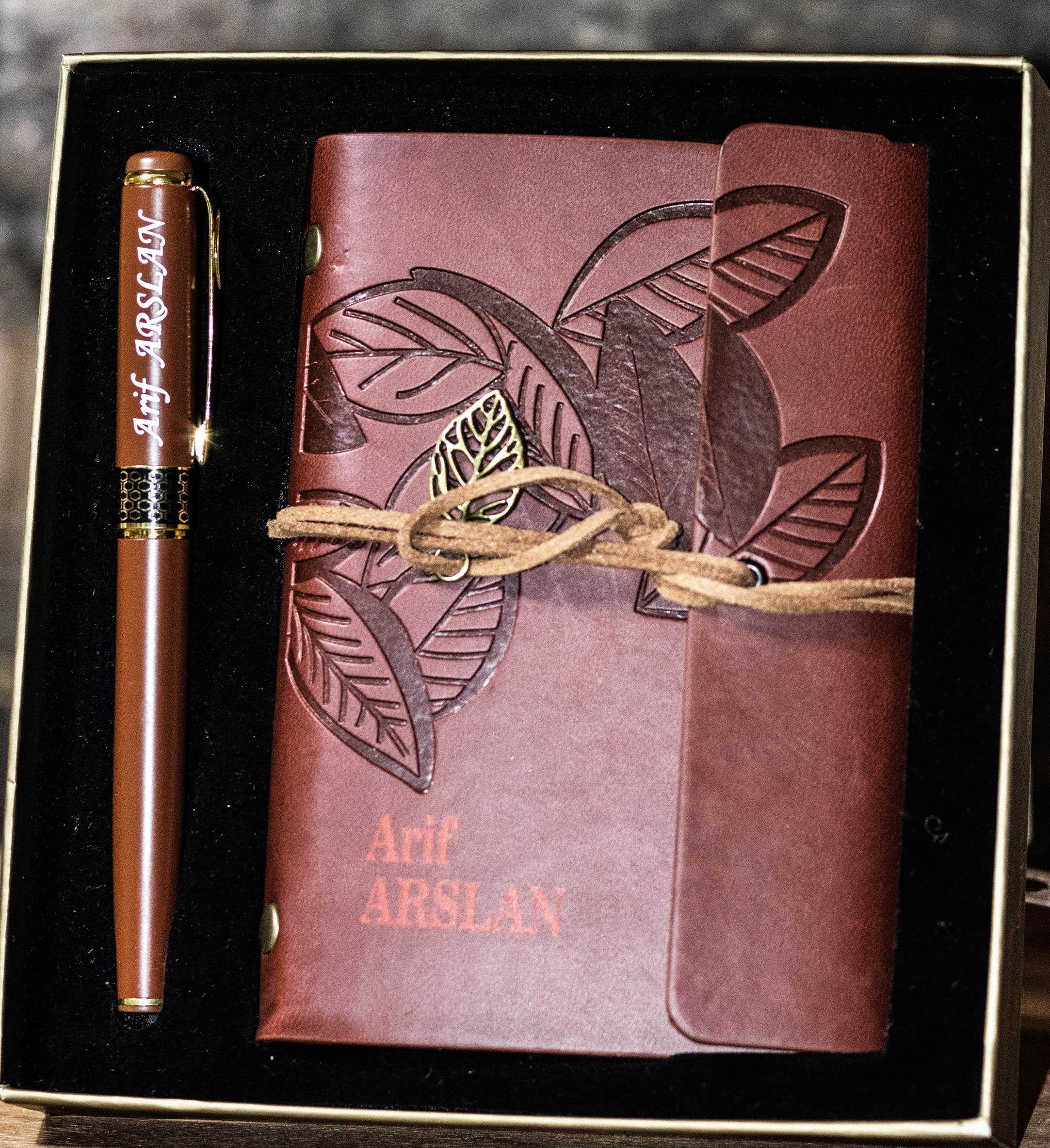 Lazer baskı ile yapılan isim / logo işlemesi kalıcıdır. Defter ve kalem özel hediye kutusunda hazırlanır.